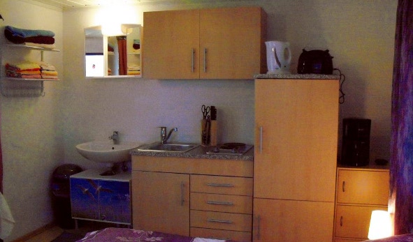 Die Miniküche ist mit Geschirr, Töpfe und Pfannen, wie auch Kaffeemaschine, Wasserkocher und Toaster ausgestattet.